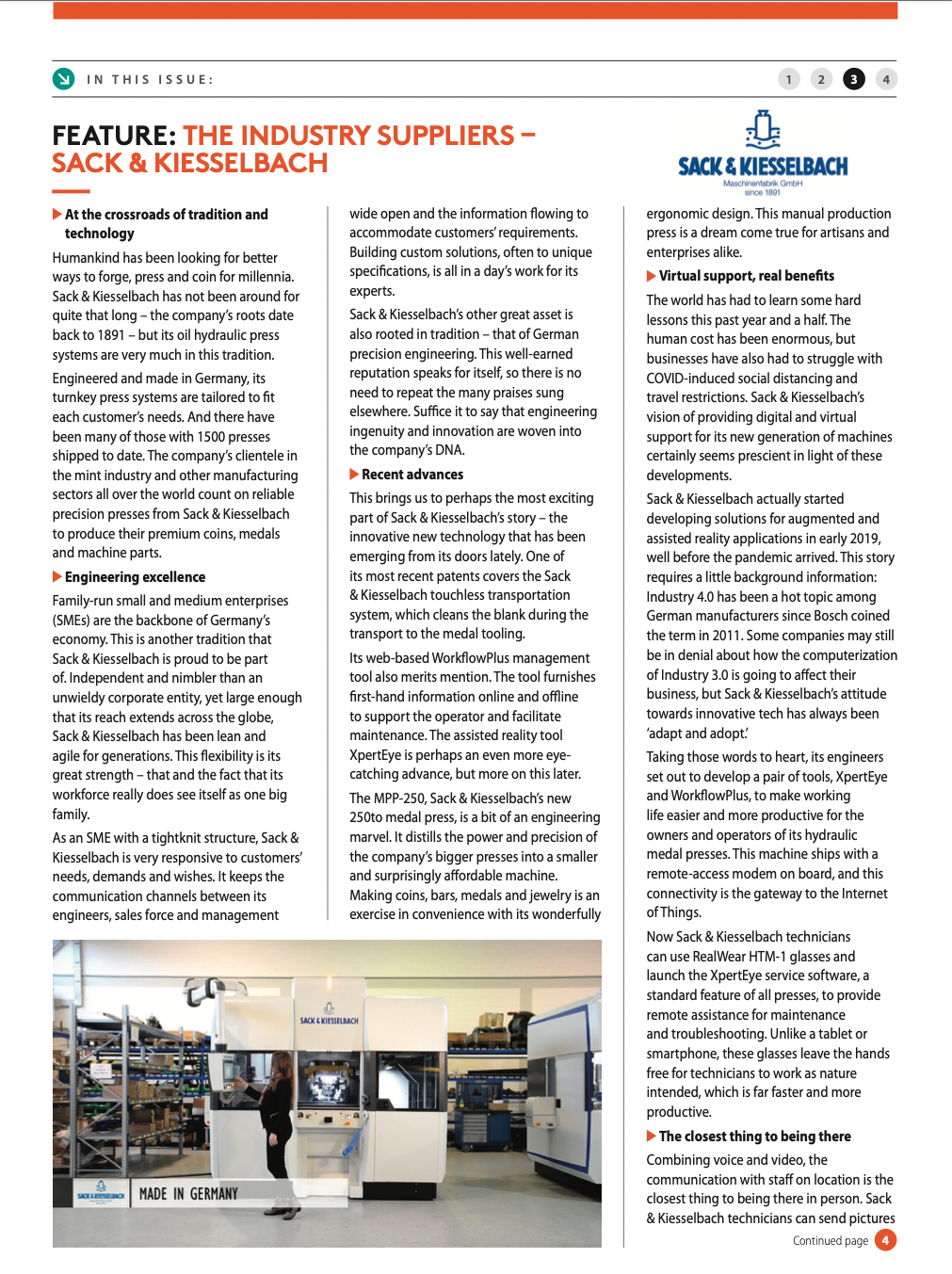 Die Sack & Kiesselbach Maschinenfabrik GmbH stellt jene Presssysteme her, mit denen diese Münzen aus Gold und Silber geprägt werden. Trotz der enormen Kräfte, die hier wirken, arbeiten die Maschinen sehr feinfühlig. Hinzu kommen einige „geheime Zutaten“: Erfahrung, Know-how und Leidenschaft.